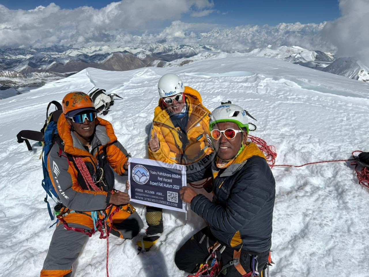 As of October 15, 2025, the entire First Ascent Team is descending safely from Camp II (6,300m) back to Base Camp. The official summit photographs, along with detailed documentation of the climbing route and technical sections, will be released shortly after the team’s safe arrival at Base Camp.