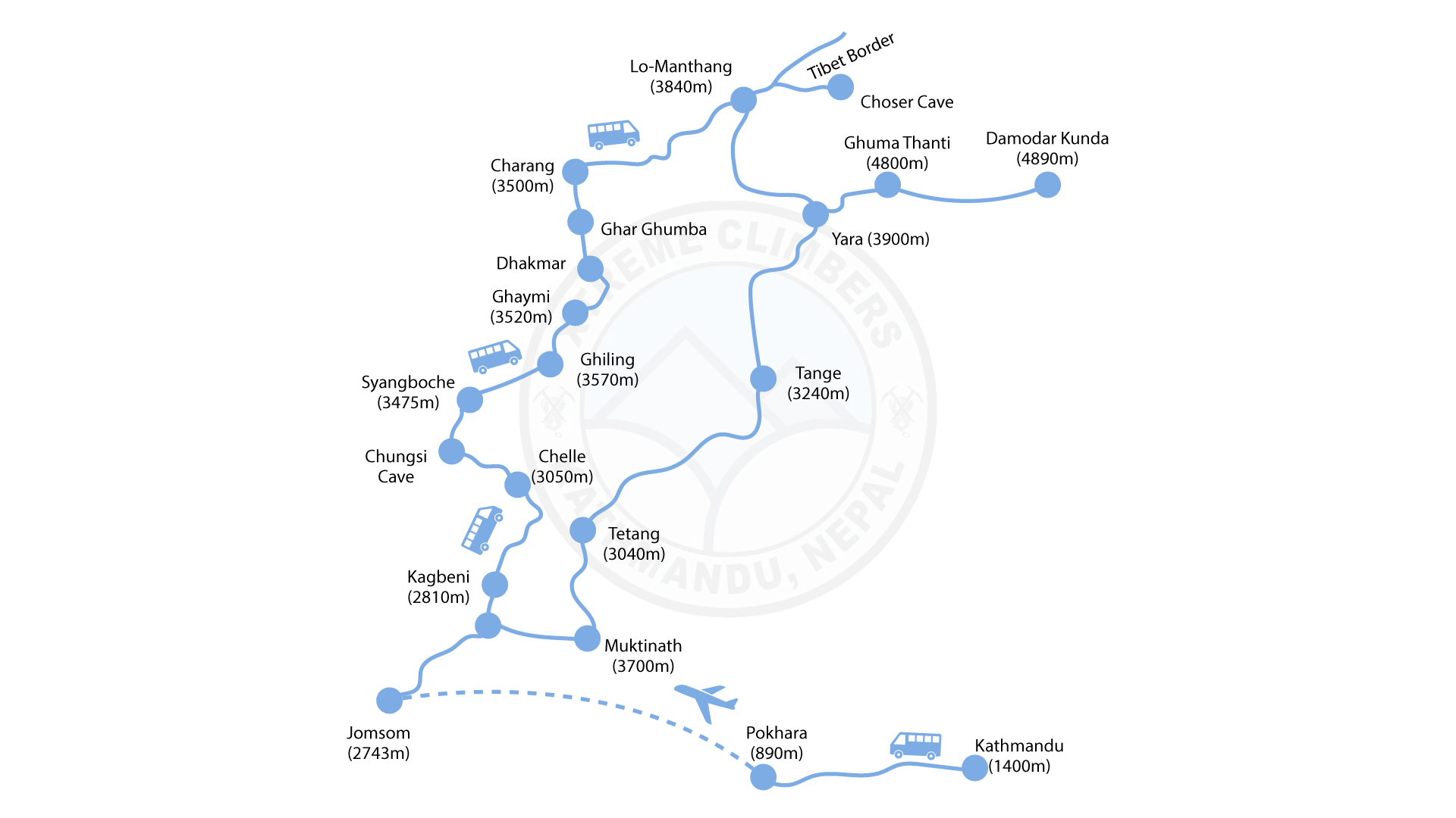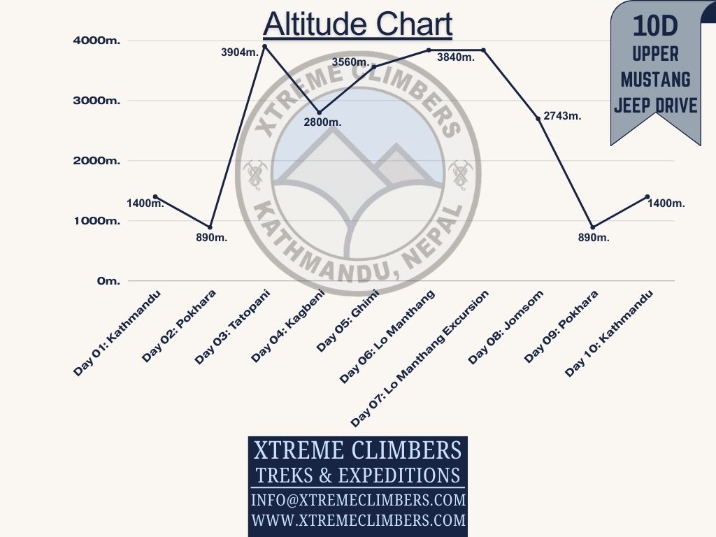 - Overland 4WD reserved private Jeep Transport: Kathmandu-Pokhara-Mustang-Pokhara-Kathmandu for both members and supporting staff as per program and scheduled itinerary.