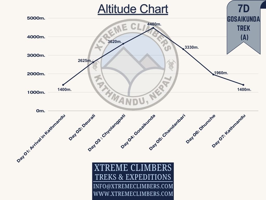 - Max. Altitude: 4480m. (Gosaikunda)