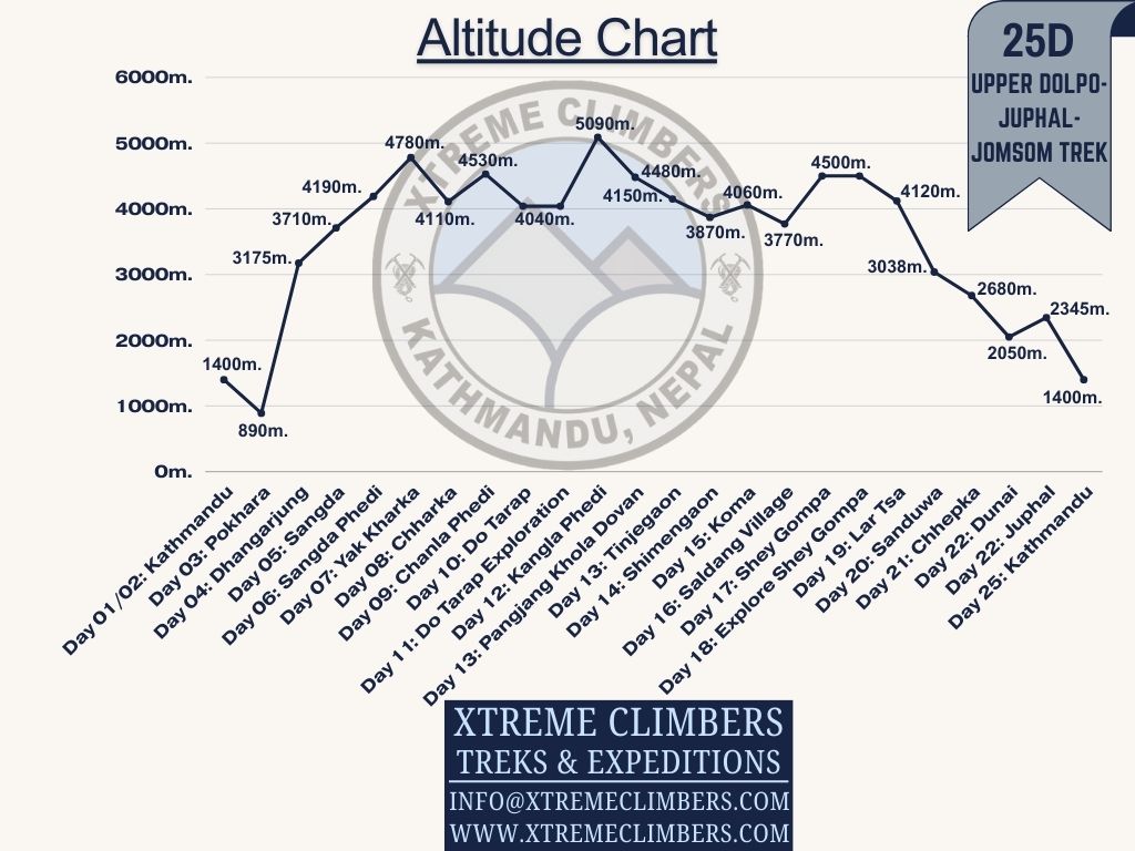 The Upper Dolpo-Jomsom to Juphal trek, leading back to Kathmandu, takes travelers to the most isolated and pristine parts of the Mid-West region of Nepal. Dolpo offers stunning and up-close views of majestic mountains, ancient monasteries, and serene turquoise lakes. The Upper Dolpo Trekking Jomsom to Juphal passes by some of the world’s grandest mountains such as Annapurna, Dhaulagiri, and Kanjiroba, along with the ancient medieval kingdom of Lower Dolpo. Dolpo is home to some of the highest villages on earth, with almost ninety percent of the region lying above 3,500 meters. With a population of less than five thousand people, Dolpo is one of Nepal's least densely populated areas.