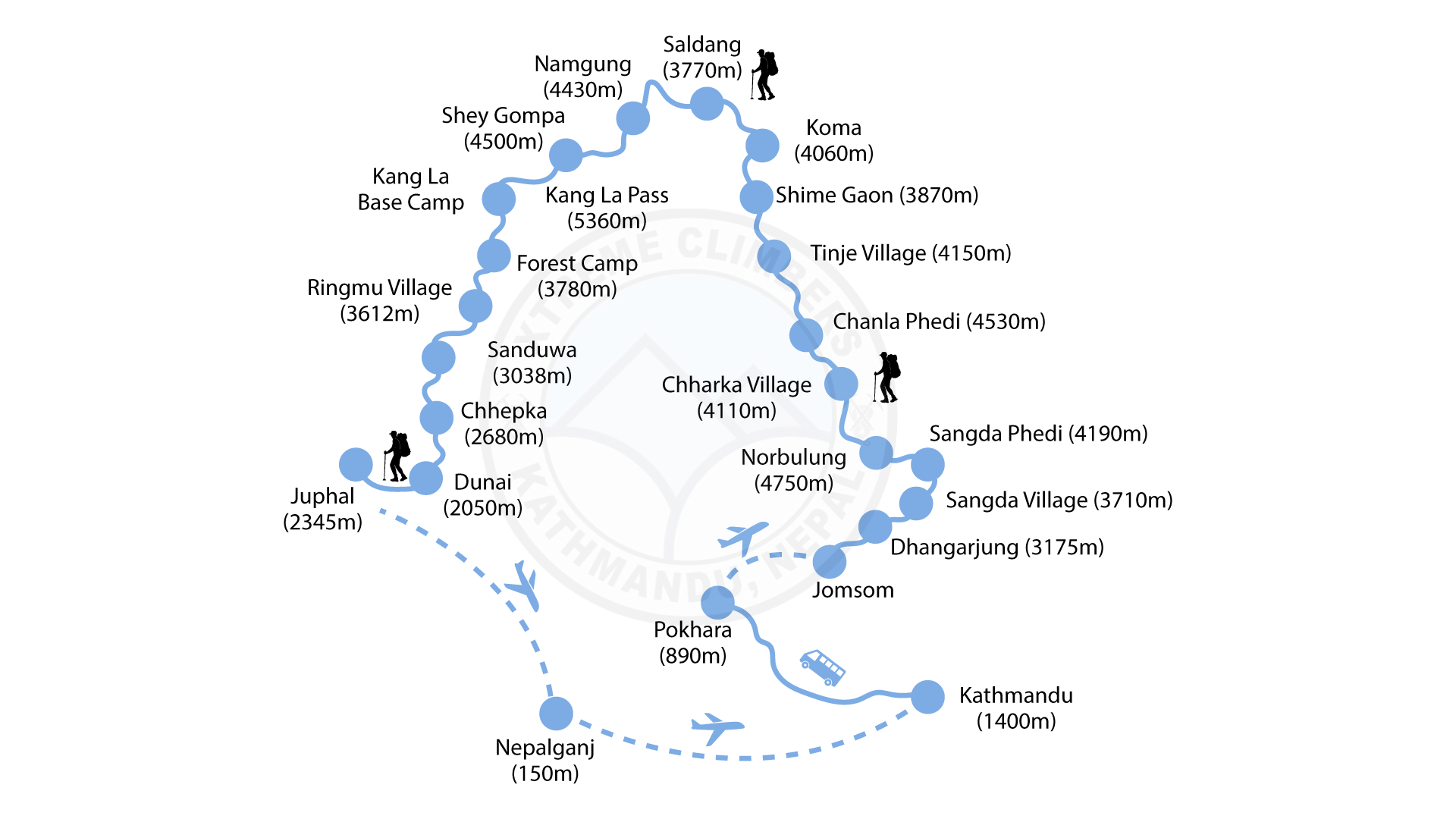 - All food, kitchen & camping staff and equipment transfers by bus to Nepalgunj and by air to Simikot.