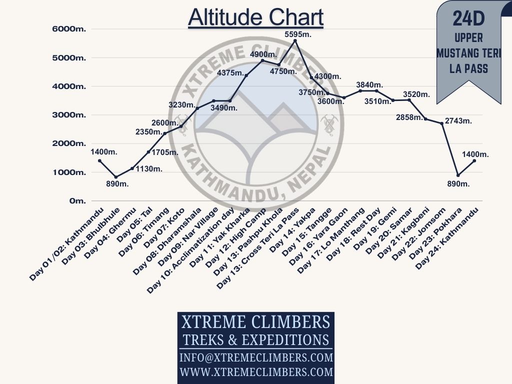 Upper Mustang to Nar-Phu via Teri-La 5595 m. Pass trek through two of the restricted and remote regions in Nepal. Offers the trekkers a chance to explore the Breathtaking Valleys, Medieval Villages, Ancient Caves, Centuries Buddhist Monasteries, Arts, and culture of local people. This remote and challenging trek is a newly explored and open destination near the Annapurna Mustang “The Last Forbidden Kingdom Of Nepal'' which is a fascinating ancient kingdom that was semi-independent from Nepal until not long ago. The region follows the route of Nar and Phu Valley which lies to the east of the Annapurna Circuit. The exploration and walking along ancient salt trade routes over a high pass to Upper Mustang is followed by the wilderness of Teri-La 5595m Pass which connects Upper Mustang with the secluded Nar and Phu.