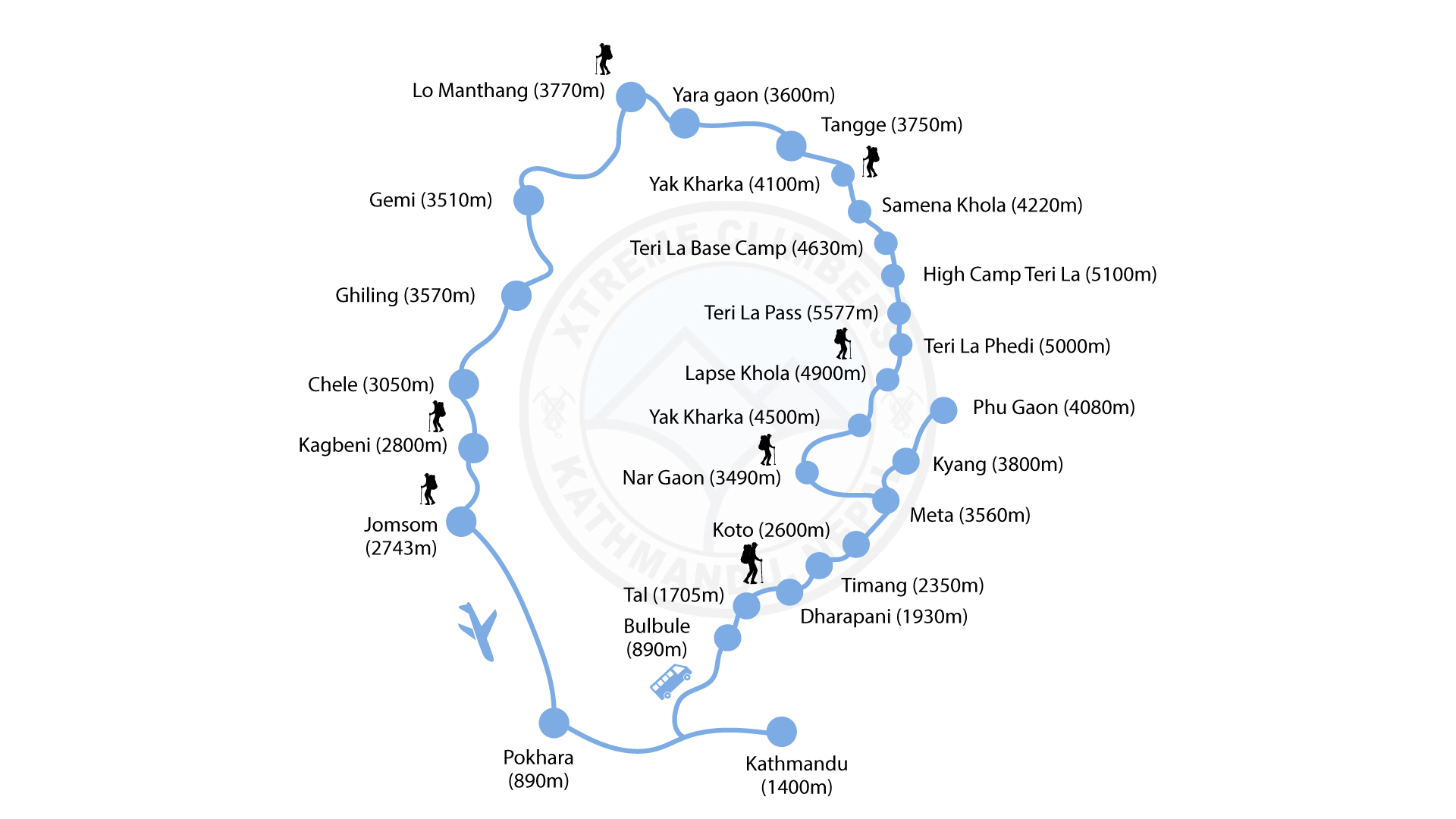 There are several alternative choices for the starting and ending point of Upper Mustang to Nar-Phu via Teri-La 5595 m. Pass trek